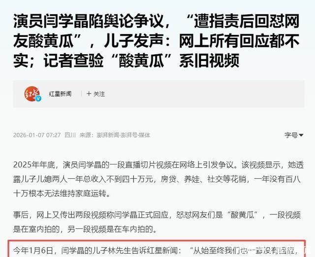 旧料嫁接掀波澜,关联方回应显分化 就在舆论愈演愈烈,闫学晶“人设崩塌”的声音此起彼伏时,事件迎来了反转。 2026年1月6日,闫学晶的儿子林傲霏接受红星新闻采访时,用一句简短的回应打破了所有猜测:“从始至终我们也一直没有回应,网上所有的回应都是不实的。” 随后,记者在社交平台查证发现,那些被网友当成“实锤”的“酸黄瓜”怒怼视频,并非针对本次“哭穷”争议的回应,而是几个月前甚至2024年的旧料。